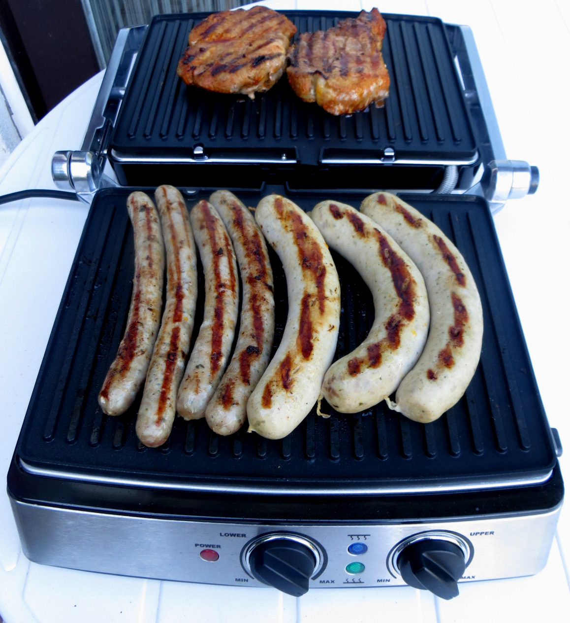 Anschließend habe ich das offene Grillen ausprobiert. Hierfür klappt man die obere Grillplatte mit Hilfe des Handgriffs nach oben, drückt anschließend den Entriegelungsknopf und klappt die Platte nach hinten herunter. Der Handgriff kann nun als Ständer verwendet werden. Diese Einstellung ermöglicht eine größere Auflagefläche, sowie eine Trennung des Grillguts, wenn man beispielsweise Fleisch und Gemüse gleichzeitig zubereiten möchte. Auch das offene Grillen hat bei meinem Test wunderbar funktioniert und die Steaks und Würstchen waren optimal gegrillt.
