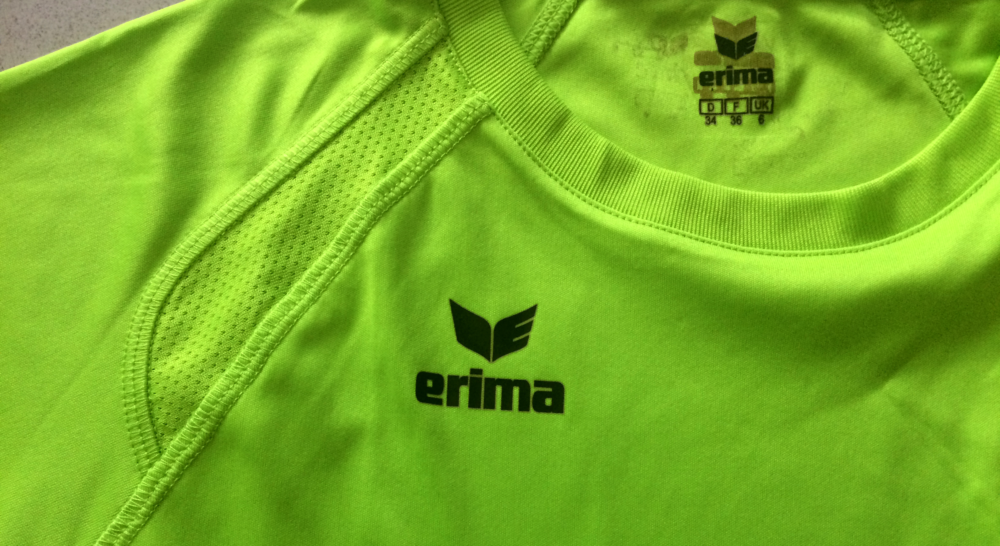 Das PERFORMANCE T-Shirt kostet 29,95 Euro und ist in einem neongrün („lemon green“) gehalten. Das Shirt hat, genau wie die Marathon Shorts von ERIMA, ein sehr angenehmes und leichtes Material. Dank des taillierten Schnittes sitzt das T-Shirt passgenau. Die Flachnähte sorgen für eine geringe Reibung während des Workouts. An den Seiten und am Schlüsselbein verfügt das PERFORMANCE T-Shirt über Stoffeinsätze. Auch dieses Fitness-Teil besteht aus einem schnelltrocknendem und feuchtigkeitsregulierendem Material und es trägt sich bei meinem Workout sehr angenehm.