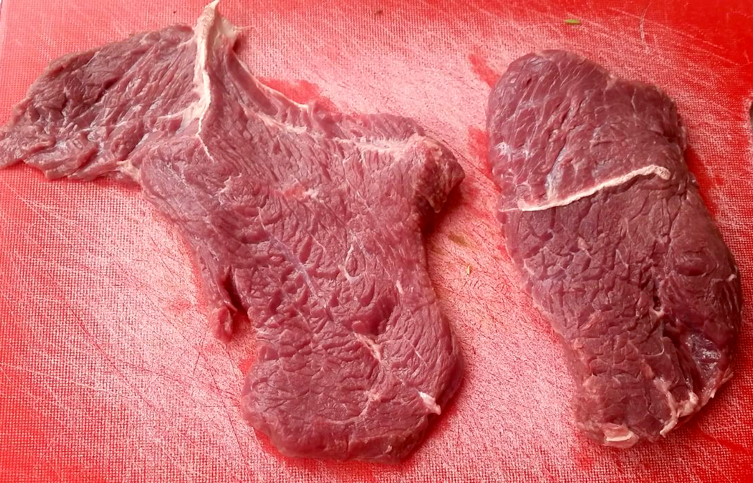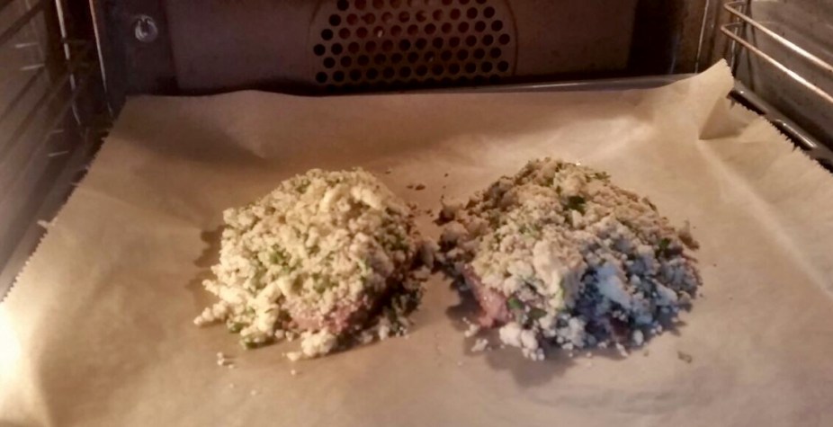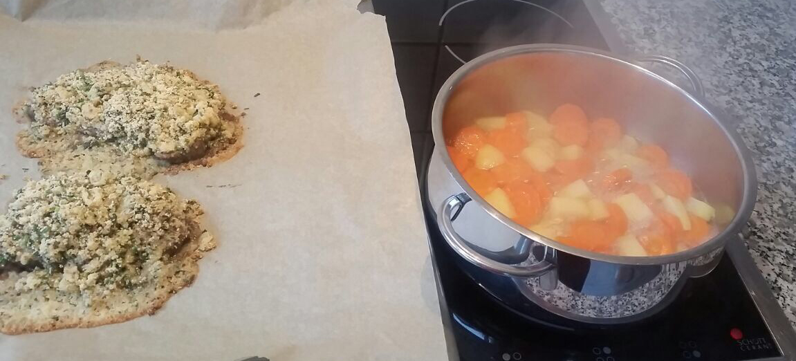 Nun habe ich Wasser in einen Topf gegeben, das Varoma aufgesetzt und 22 Minuten garen lassen. Nebenbei habe ich in einer Pfanne Öl erhitzt und die Rinderhüftsteaks angebraten. Beide Seiten jeweils ein bis zwei Minuten lang. Die Rinderhüftsteaks habe ich auf ein Backblech gelegt, sie mit der Kräuterkruste bedeckt und das Ganze noch für circa 8 Minuten in den Backofen geschoben.